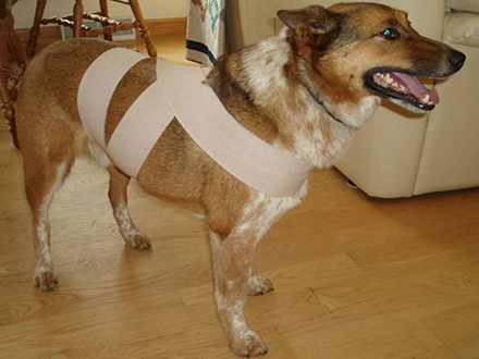 Tome nota de como fazer: use faixa de um tecido macio e firme, enrole o cão de modo que a atadura envolva o peito e o dorso, finalize dando um nó na região da coluna.